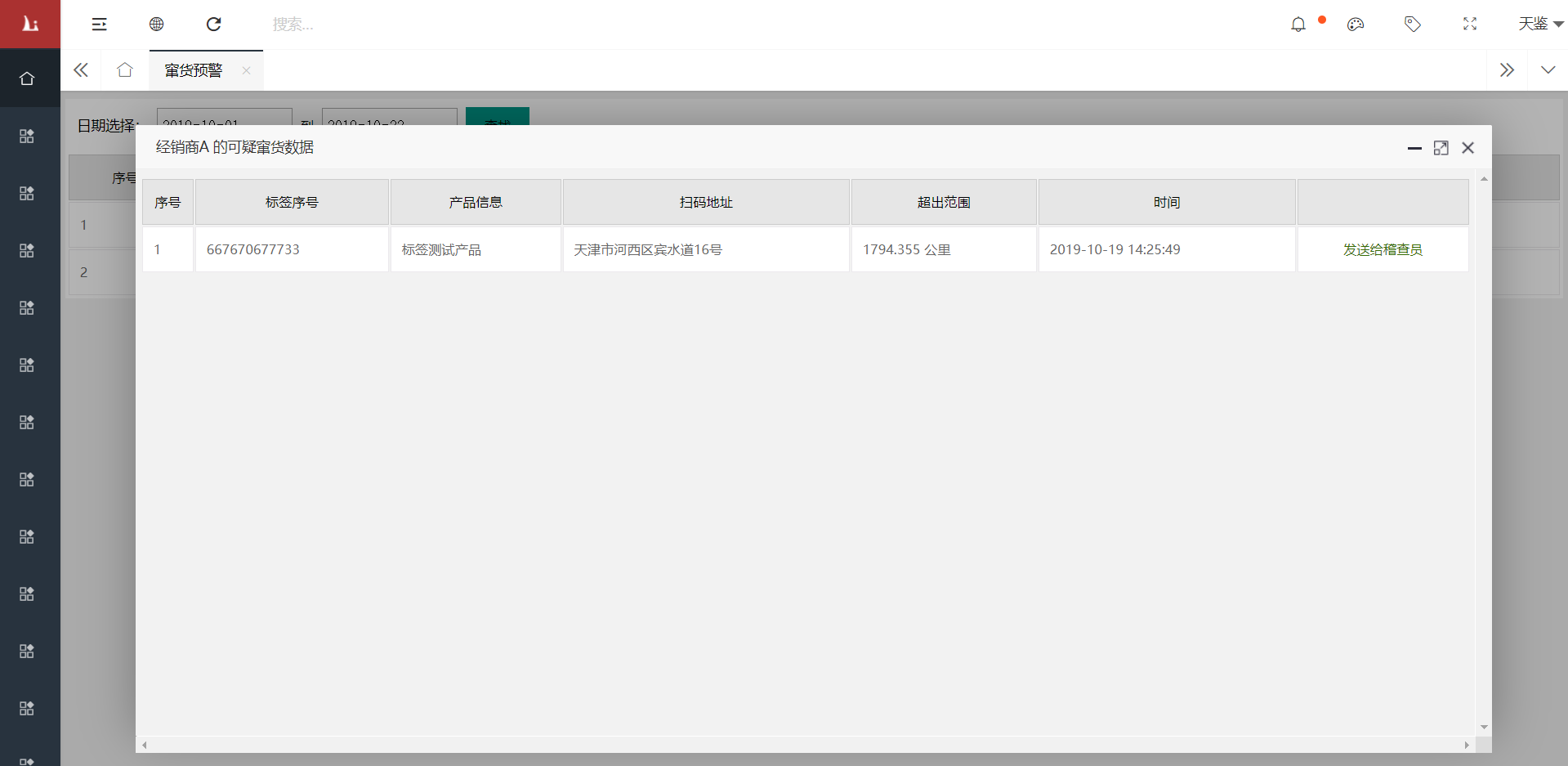 查看竄貨詳細信息,標簽序號,產品名稱,掃碼地址,超出範圍等,還可以發送短信給附近的稽查人員。