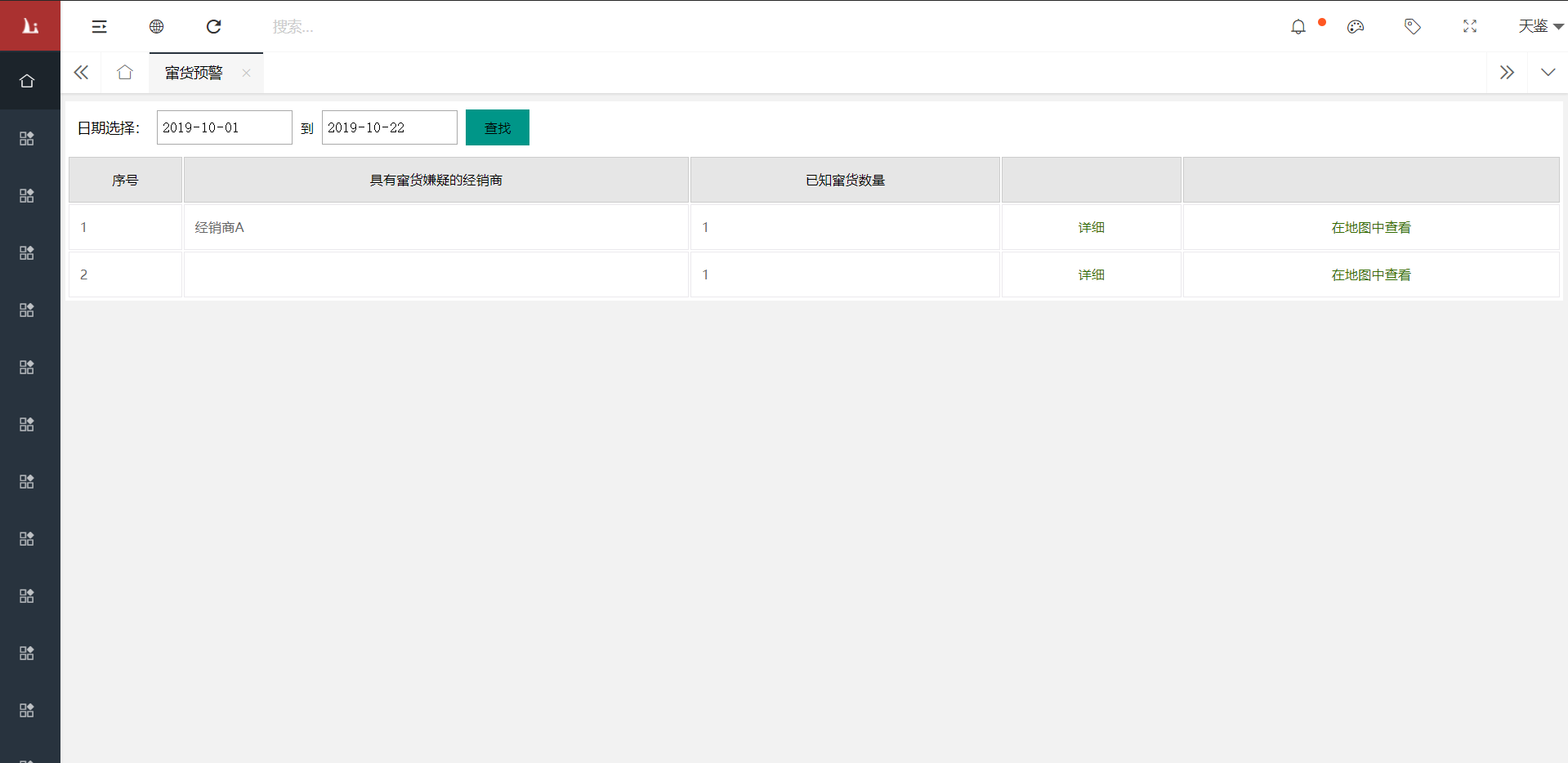 通過竄貨預警後台,可以看到具有竄貨嫌疑的經銷商,及竄貨數量。
